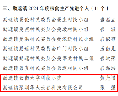 近日,深圳华大云谷科技有限公司被勐海县勐遮镇人民政府评为“勐遮镇2024年度粮食生产先进企业”。