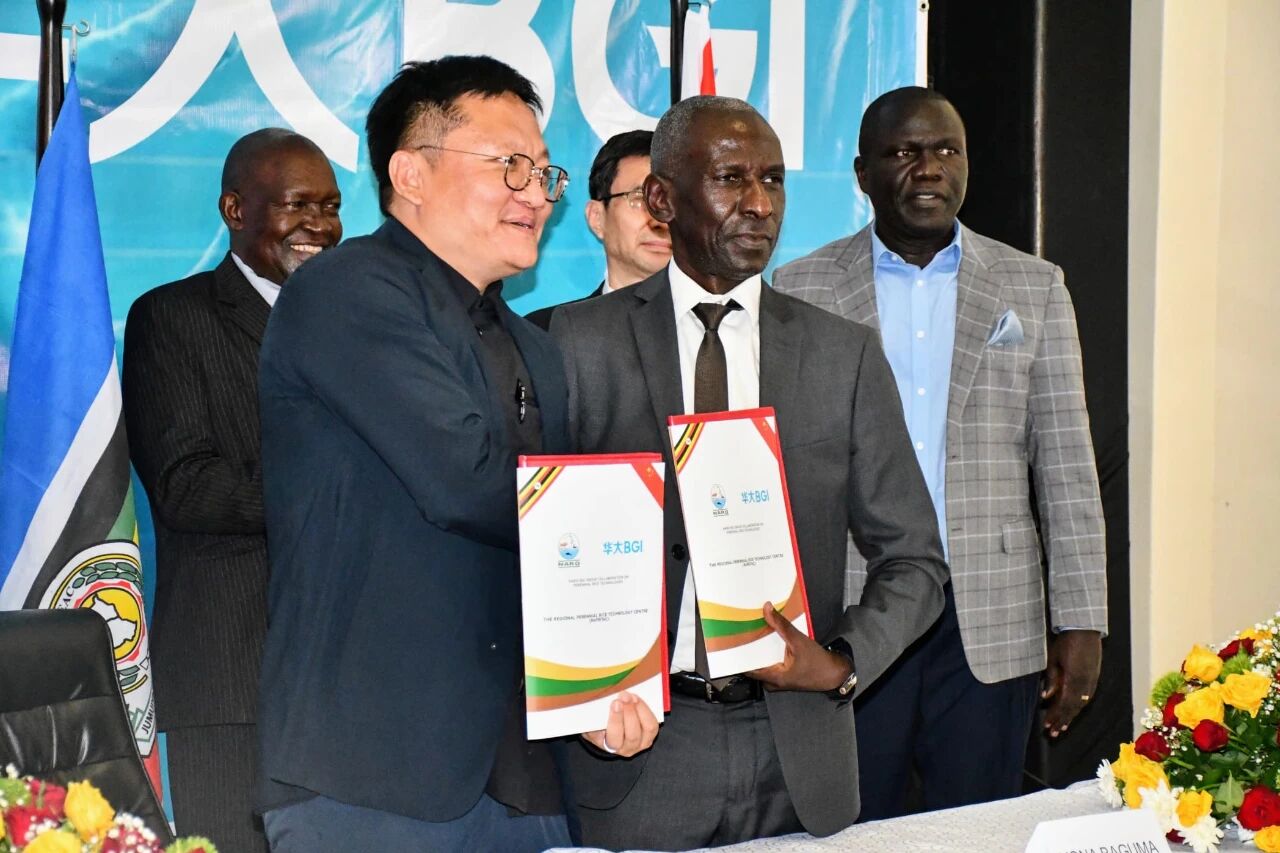 活动现场,在中国驻乌干达大使张利忠、乌干达农科院理事会主席William Mukani博士、中国驻非盟使团参赞刘晓明和非盟代表Beatrice Egulu博士的共同见证下,乌干达农科院院长Yona Baguma博士与华大集团首席执行官尹烨博士分别代表双方签署了合作备忘录。与会嘉宾共同为中国-非洲多年生稻技术合作中心及华大-乌干达农科院农业、渔业及畜牧业卓越中心揭牌。