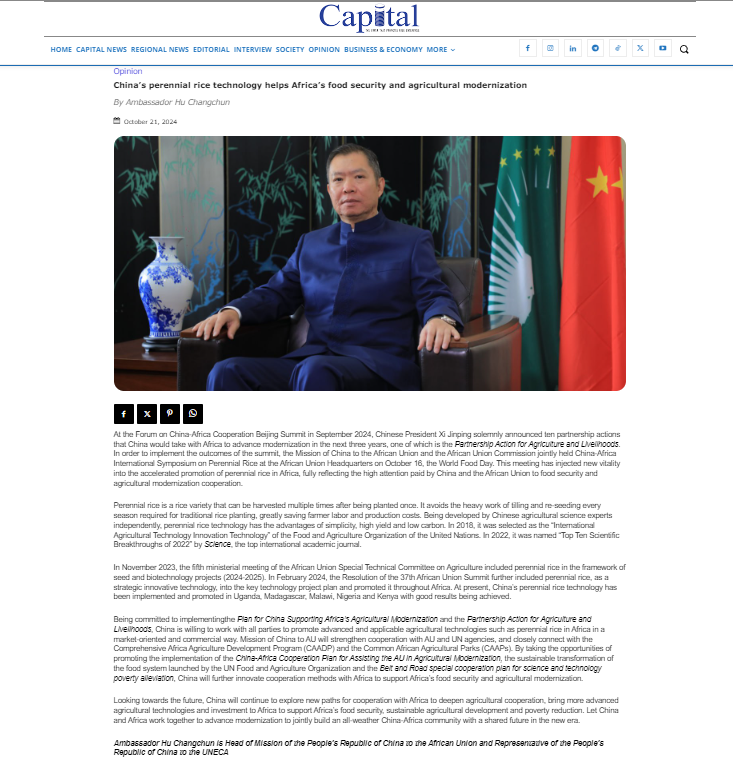 驻非盟使团团长胡长春大使在埃塞俄比亚媒体发表署名文章:《中国多年生稻技术助力非洲粮食安全和农业现代化》