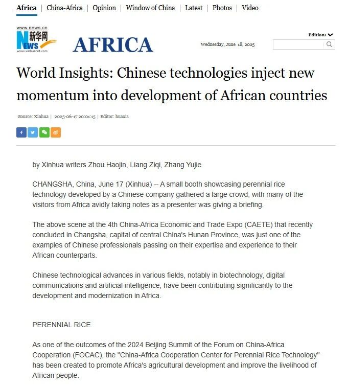 近日,新华社发布中非经贸博览会英文特别报道,聚焦中非科技合作的丰硕成果。一粒种子改变世界,一项技术联结中非。在圆满落幕的第四届中非经贸博览会上,中国自主研发的多年生稻技术成为非洲代表争相了解的焦点,这背后是中国农业科技助力非洲粮食安全的生动实践。