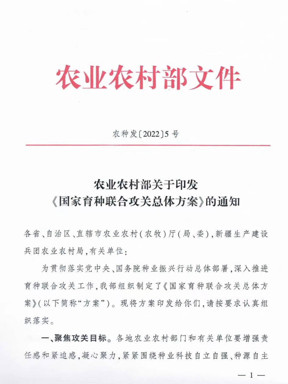 2022年12月,农业农村部印发《国家育种联合攻关总体方案》,召开国家育种联合攻关工作推进会。构建以十大优势企业自主攻关为塔尖、以十大主要粮食作物和重要畜种联合攻关为塔身、以64个重要特色物种育种联合攻关为塔基的金字塔攻关阵型,覆盖粮棉油糖果菜茶肉蛋奶多物种,组建了90个攻关,加快培育自主知识产权的优良品种,部署开展短生育期冬油菜、再生稻、耐盐碱作物品种选育示范工作,加快专用突破性新品种选育攻关和示范推广。