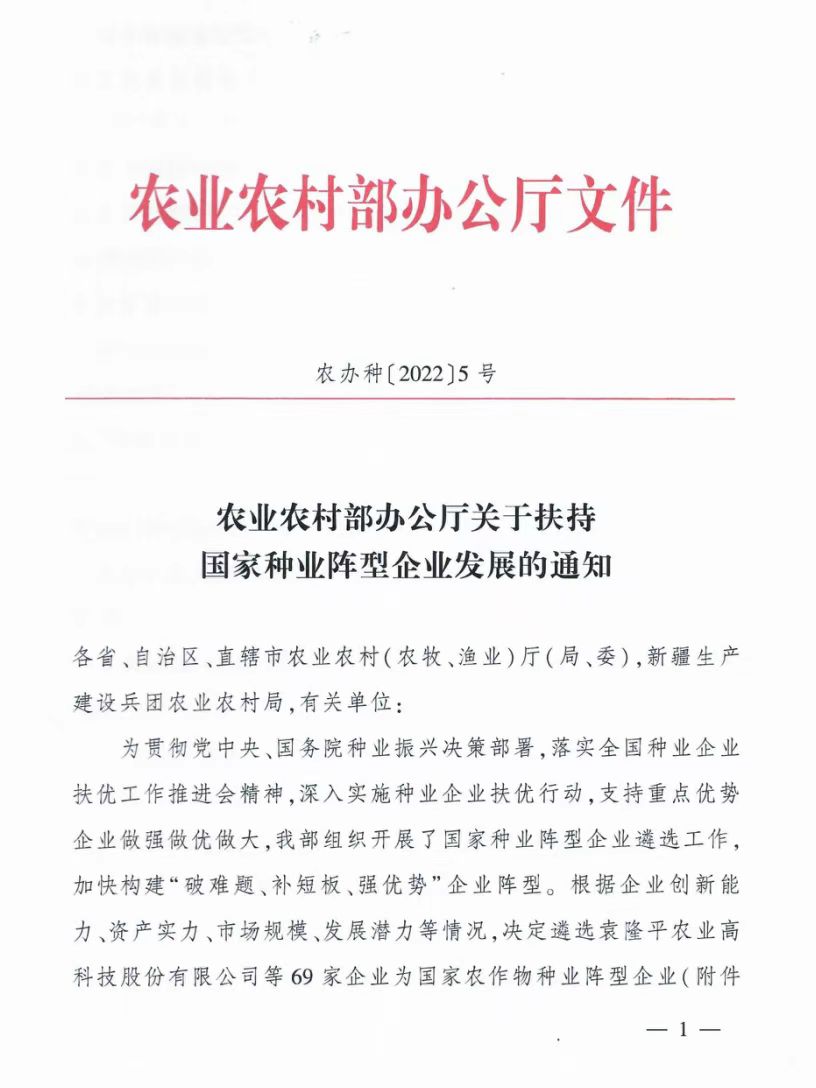 2022年8月,农业农村部办公厅印发关于扶持国家种业阵型企业发展的通知,支持重点优势企业做强做优做大。遴选隆平高科等69家农作物种业企业,温氏集团等86家畜禽种业企业,富发水产等121家水产种业企业作为重点优势种子扶持企业。