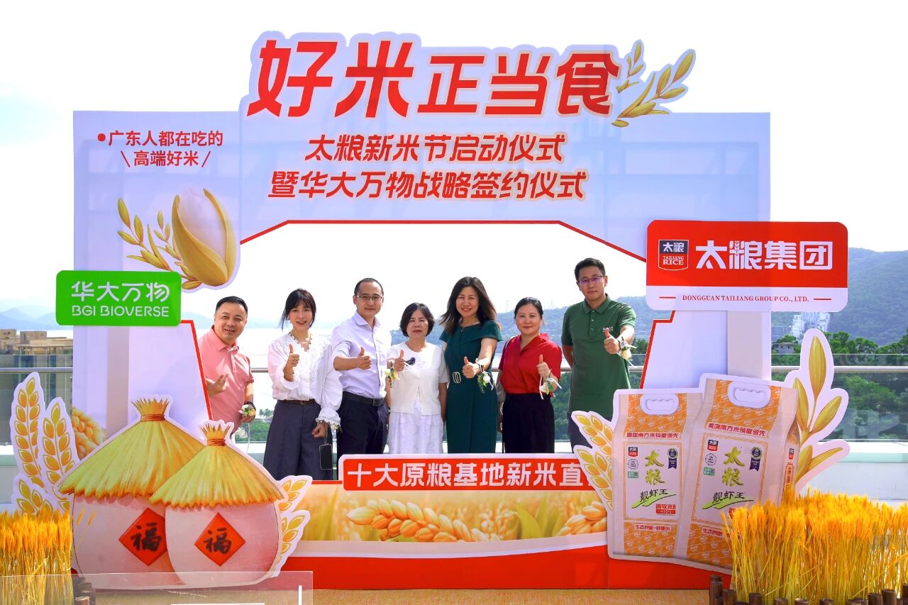 近日,以“好米正当食”为主题的太粮新米节启动仪式暨华大万物与太粮集团战略合作签约仪式在深圳华大时空中心成功举办。太粮集团董事长曾丽芳、高级副总裁熊智飞一行与华大万物副总经理刘娜、副总经理杨金龙一行出席活动。此举标志着双方在品质大米全产业链升级方面步入全新阶段,未来将携手以科技创新赋能产业升级,共同推动主食消费品质全面提升。