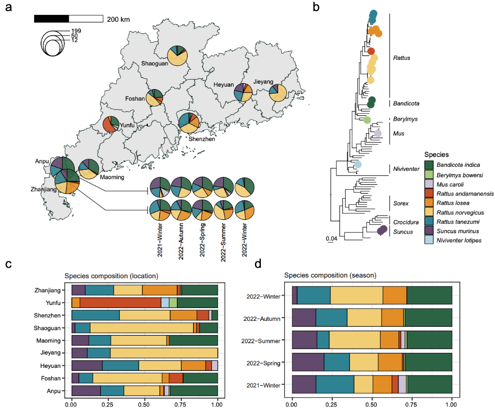 为了解答这些问题,来自中山大学医学院、华大生命科学研究院、广东省疾病预防控制中心等机构的联合研究团队,在广东省内9个不同生态背景的地区,对858只小型哺乳动物(涵盖9种常见物种)个体进行了系统的“全感染组(Infectome)”分析。基于宏转录组测序,研究团队首次刻画了广东省小型哺乳动物的全谱病原体生态图谱,揭示了RNA病毒、DNA病毒、细菌、真菌和寄生虫在内的病原体生态群落结构与潜在传播风险。相关研究成果发表于国际学术期刊《自然·通讯》(Nature Communications)。