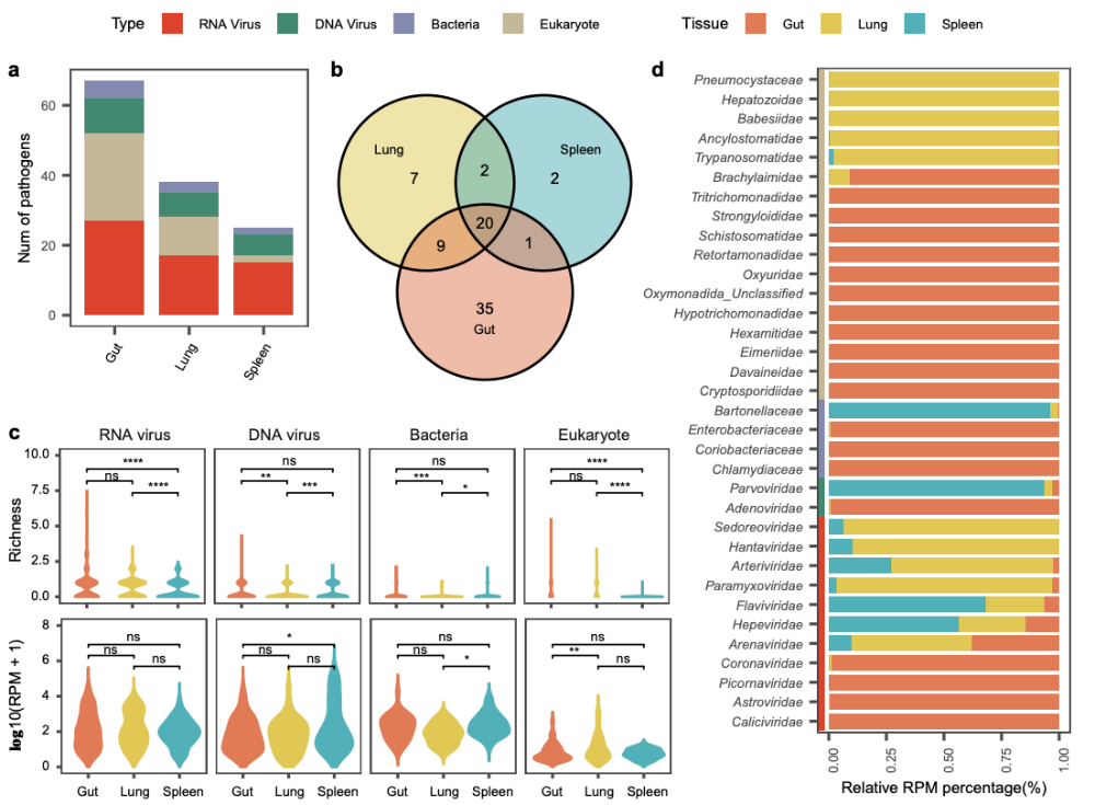 研究团队对每个个体的肺、脾、肠道三种关键组织进行了宏转录组测序,共获得2408份高质量测序数据,实现了在个体组织分辨率上对感染组的精细解析。通过宏转录组分析,研究团队鉴定出76种潜在哺乳动物病原体,包括29种RNA病毒、12种DNA病毒、5种细菌和30种真核微生物,其中33种为全新发现的病原体,这揭示了该地区病原体高度的多样性和独特性。研究还检测到多种已知的人兽共患病病原体,如汉坦病毒、大鼠戊型肝炎病毒、温州沙粒病毒、广州管圆线虫等,证实了这些动物是新发传染病的潜在储存库。