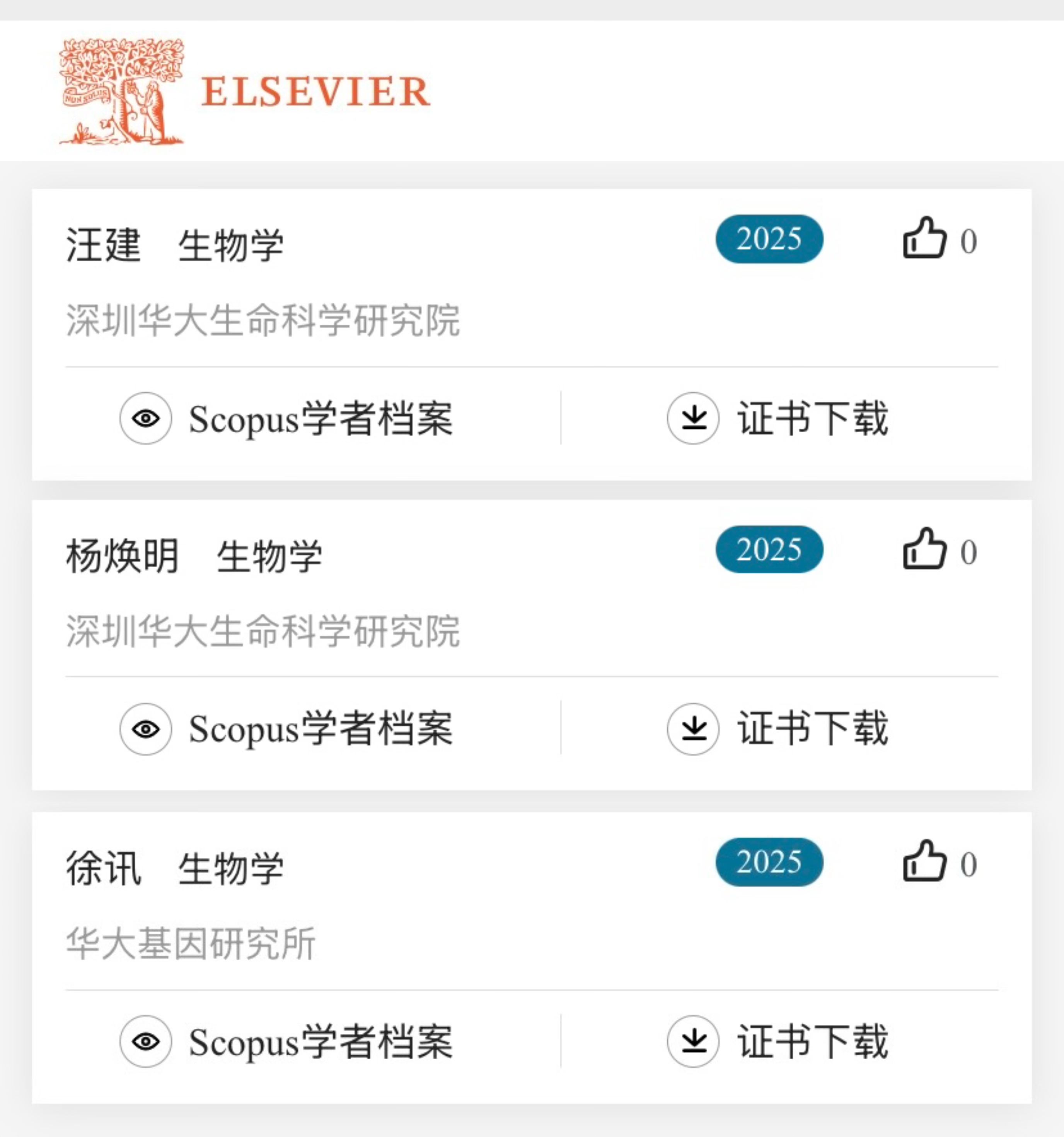 1月30日,爱思唯尔(Elsevier)正式发布2025“中国高被引学者”榜单。华大集团董事长、联合创始人汪建,华大集团联合创始人、理事长杨焕明,华大集团首席研究员徐讯入选。这也是华大科研工作者连续12年跻身该榜单。