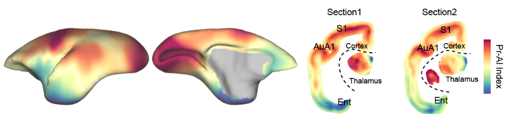 Pr-Al轴的发现,首次从分子层面回答了灵长类高级联合皮层从何而来的关键问题,成功统一了此前关于大脑皮层演化的“双起源假说”与“分子锚定假说”。此外,研究证实这种Pr-Al轴不仅存在于大脑皮层,还贯穿了丘脑、纹状体等全脑核团,形成了一套全脑协同的演化逻辑。