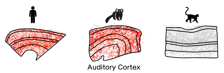除了Pr-Al对立分子梯度轴,研究团队还获得了一项关于社交的意外发现:虽然猕猴在进化树上离人类更近,但在听觉皮层的分子特征上,狨猴反而与人类表现出更高的相似性。