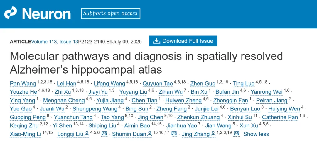 7月,基于华大自主研发的时空组学技术Stereo-seq、单细胞测序技术以及高通量测序平台等技术工具,由华大生命科学研究院、浙江大学医学院等机构组成的科研团队成功绘制了全球首个阿尔茨海默病患者海马体的单细胞分辨率“时空图谱”。该研究不仅揭示了阿尔茨海默病发生的关键分子机制,还发现了具有诊断价值的血液标志物,为阿尔茨海默病的临床诊断、靶向治疗等提供了坚实的科学基础。相关成果以封面文章形式刊发于《神经元》(Neuron)。