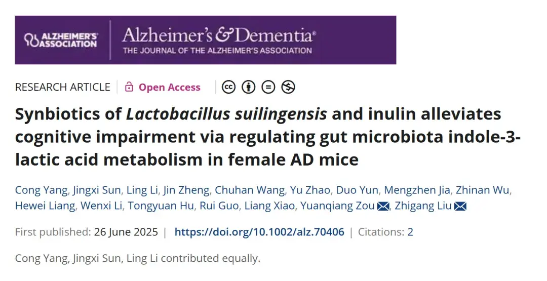 2025年,针对阿尔茨海默病,团队首次发现肠道菌群影响大脑抗炎机制的关键——肠道菌群代谢物吲哚乳酸,并设计了一种由特定乳酸杆菌和菊粉组成的合生元,验证了其靶向干预策略的有效性,为阿尔茨海默病的预防与治疗带来新曙光。