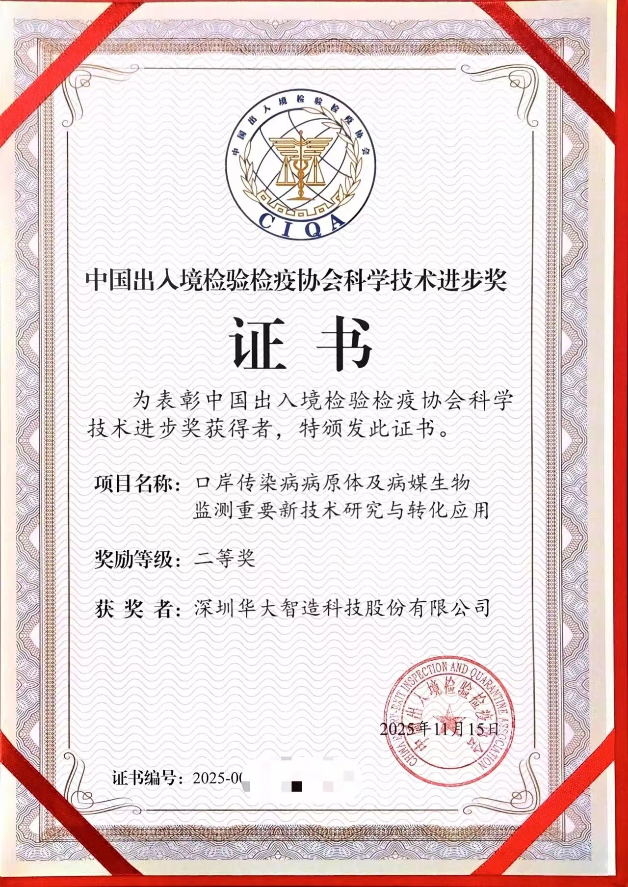 由华大智造携手五家海关单位共同完成的《口岸传染病病原体及病媒生物监测重要新技术研究与转化应用》项目,荣获中国出入境检验检疫协会科学技术进步奖二等奖。该项目成果丰硕,累计发表论文33篇、授权知识产权19项、制定国家/团体标准3项,为口岸公共卫生核心能力建设提供坚实的技术支撑。