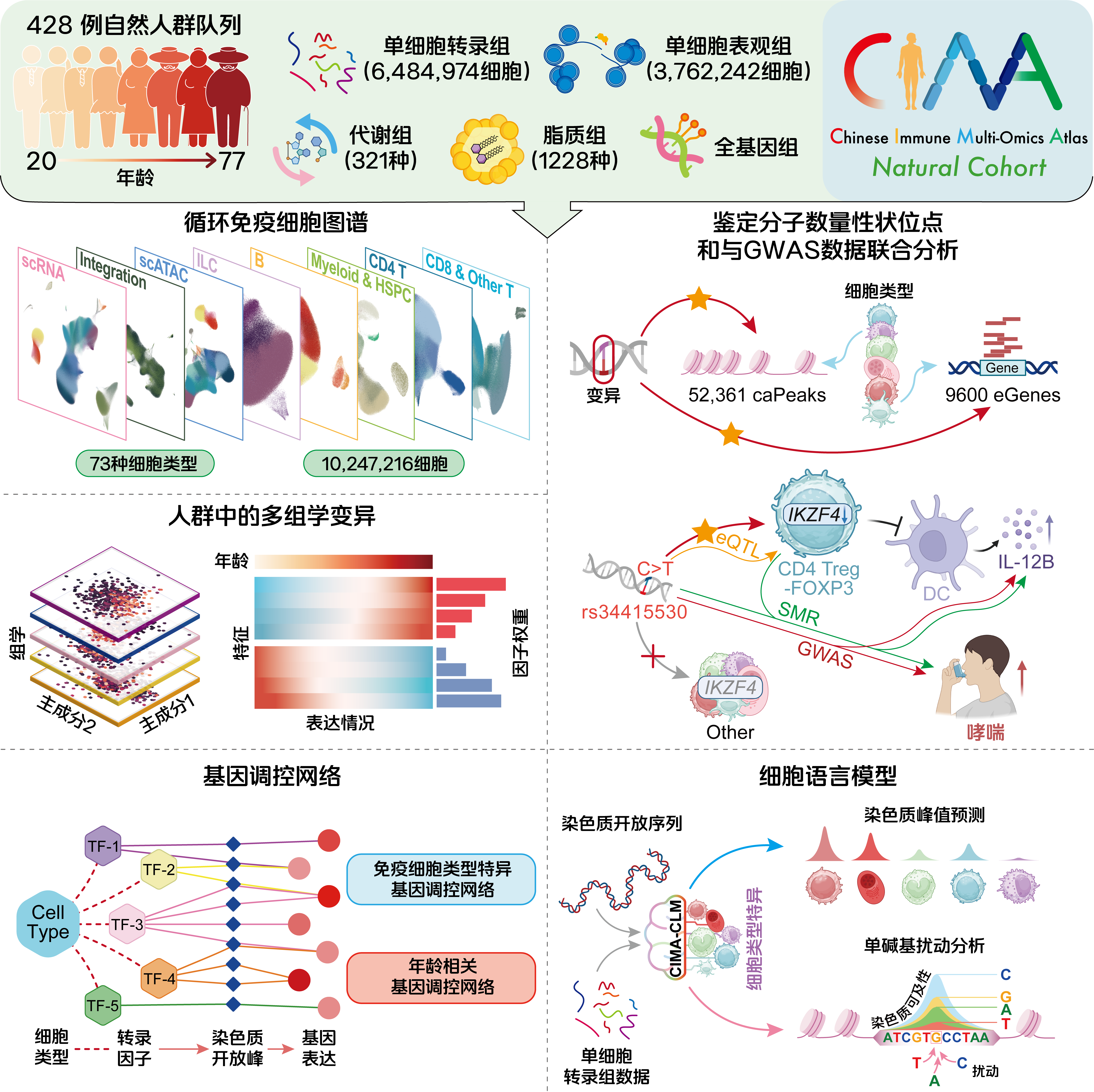 “CIMA构建了人群高分辨率免疫参考图谱”,中国工程院院士、中国医学科学院血液病医院(血液学研究所)所院长程涛表示,“不仅在单细胞水平绘制了遗传变异对基因表达和染色质开放性的影响,更通过多组学整合,阐明了众多与免疫疾病风险相关的多效性调控位点,将遗传关联推向机制理解。同时,创新开发的CIMA-CLM智能模型,为从序列和表达信息预测染色质状态及评估非编码变异功能提供了新工具。”