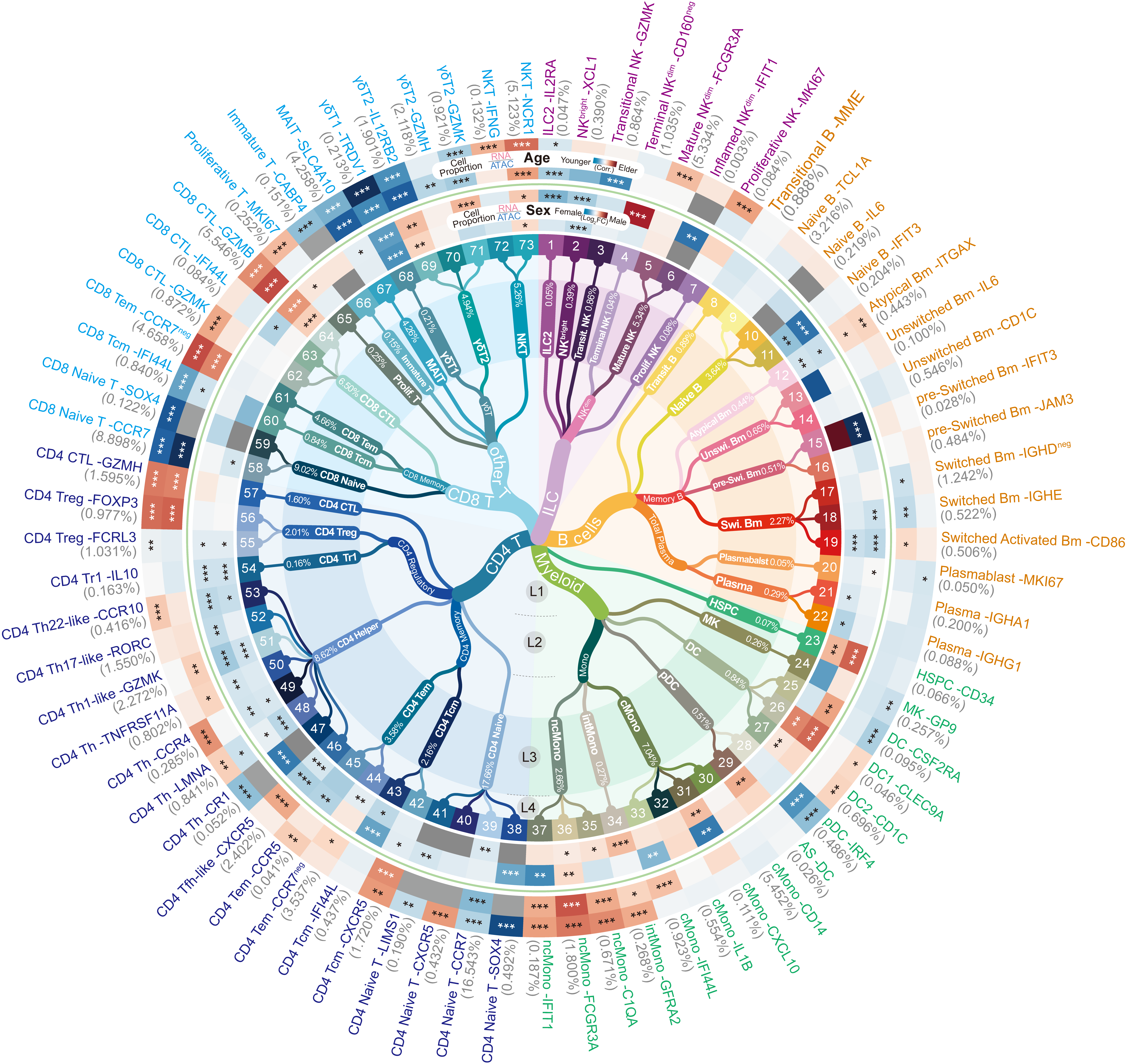 基于千万级的外周血免疫细胞的单细胞转录组、表观组数据,以及血浆脂质组、代谢组的多组学数据,研究团队成功鉴定出73种免疫细胞亚型,包括那些在血液中占比不足千分之一的罕见细胞。这些细胞虽然数量稀少,却在特定免疫应答中发挥着关键作用。以往的研究方法很难捕捉到这些稀有细胞,而本研究借助千万规模的单细胞数据,终于让这些“神秘士兵”露出了真容。研究团队为每种细胞建立了详细的“身份证”,记录了它们的分布及基因表达特征,并且结合了志愿者的生理数据,探索了年龄和性别等因素与特定免疫细胞特征的关联。