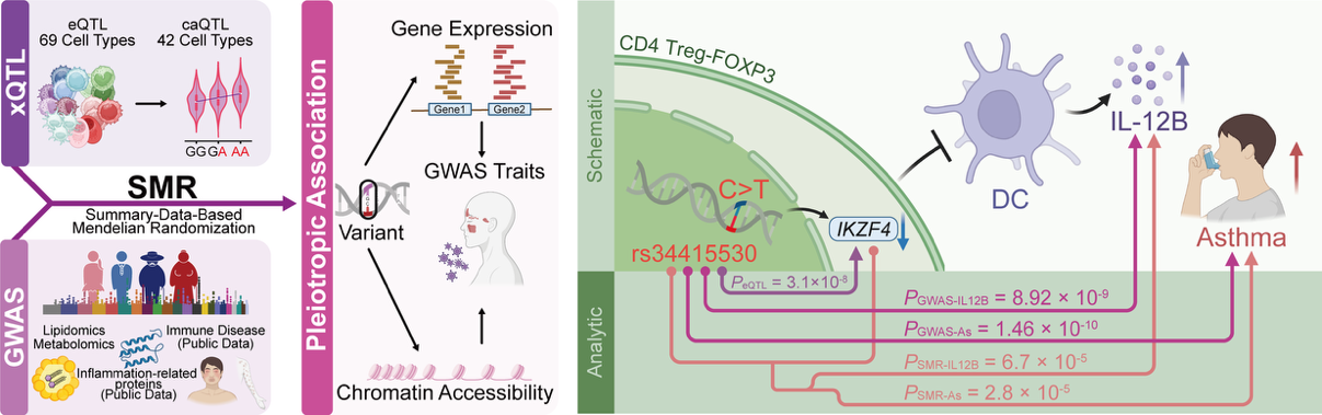 研究团队整合了154种分子和疾病性状的数据,在68种免疫细胞中发现了1196个显著的遗传关联。其中,73.2%的关联仅存在于特定细胞类型。这意味着,我们不仅知道“哪个变异与某种疾病相关”,还可以利用这张“高清导航图”,进一步回答这个变异主要是在哪一类免疫细胞里发挥作用,以及是通过影响哪个基因、哪条通路,改变了疾病风险。