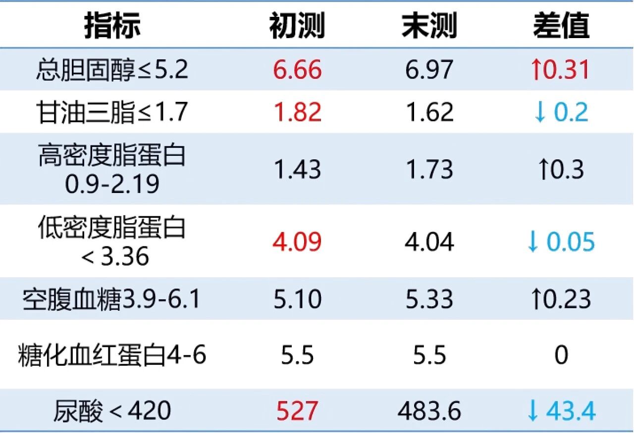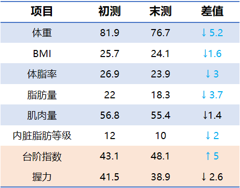 最后结营我们又做了一遍体测和体检,我原本的高血脂、高尿酸问题都有所改善,体重上瘦了10来斤,并且减的70%以上都是脂肪。我自己能明显感觉到身体轻盈了,肚子也小了很多。