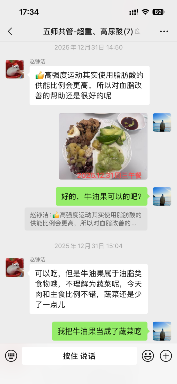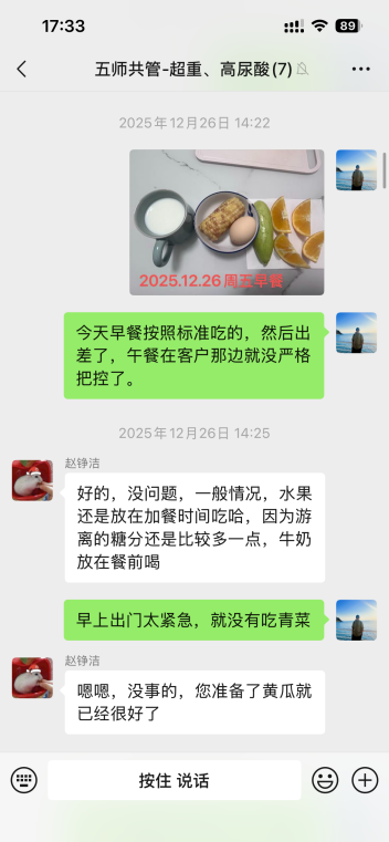 另外,五位老师加上训练营的负责人董叶雯老师,和我单独建了一个微信群,我每天把自己的饮食和运动情况发到群里,老师们会实时给出点评和改进建议,而且他们监督得也很严格。记得有一回我发了张午餐照片,营养师赵峥洁一眼就看出我的蛋白质比例不太合理,当天我就调整了食材搭配。他们真的特别细心,也让我慢慢学会了怎么吃才更科学。运动方面,如果运动心率区间或燃脂时长超出范围或者没达标,李丽凤老师也会适时提醒和给出建议。